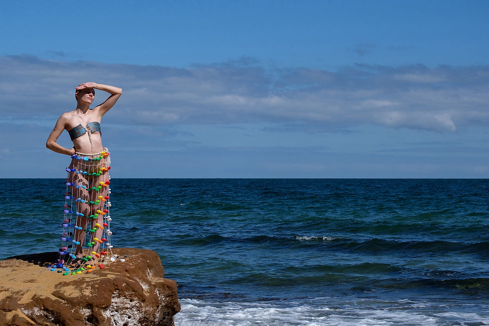This project was inspired by marine pollution. The garment was made out of recycled paper cups, cardboard and 220 plastic bottle caps.